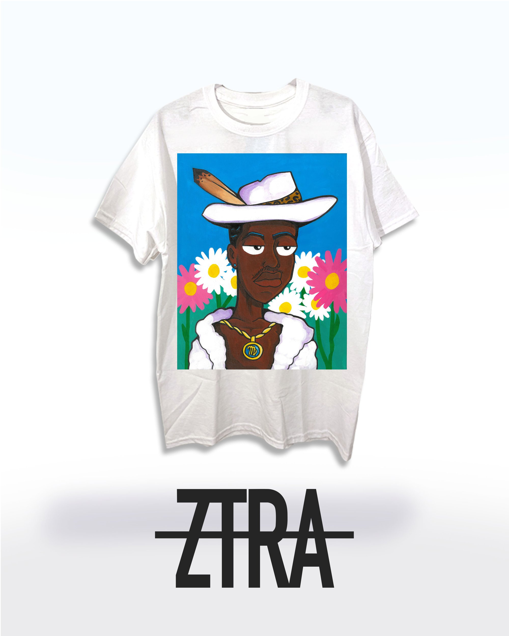 The "FUR COAT IN AUGUST" tee features a painting from the "Imitates Art" collection, this was actually a painting from 2020 that I found in my studio earlier this year and I took some time to revisit the work with some of the new skills that I know. This shirt calls back to early shirts that I put out that were just images of my paintings on shirts. The painting shows a Black man standing in a field of flowers in front of a blue sky, wearing a white fur coat, the man in the painting is also wearing a Virgo necklace to celebrate the wonderful Virgos that I have had in my life.